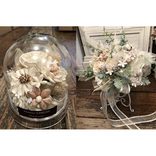 天然の草や草の皮、葉脈、木の実など、すべて土に還る自然素材を使ったインテリアフラワーです。