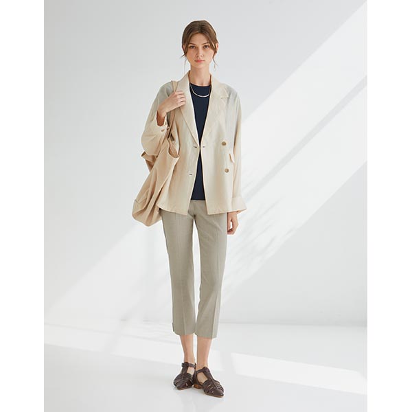 計算された丈バランスで脚長に!ヒップポイント・膝位置を高く見せる〈ビースリー〉の黄金比パターンを採用。センタープレスを入れることで脚のラインをスラリとまっすぐ演出。スリットの入った足首見せのクロップド丈で、夏の着こなしを軽やかに彩ります。