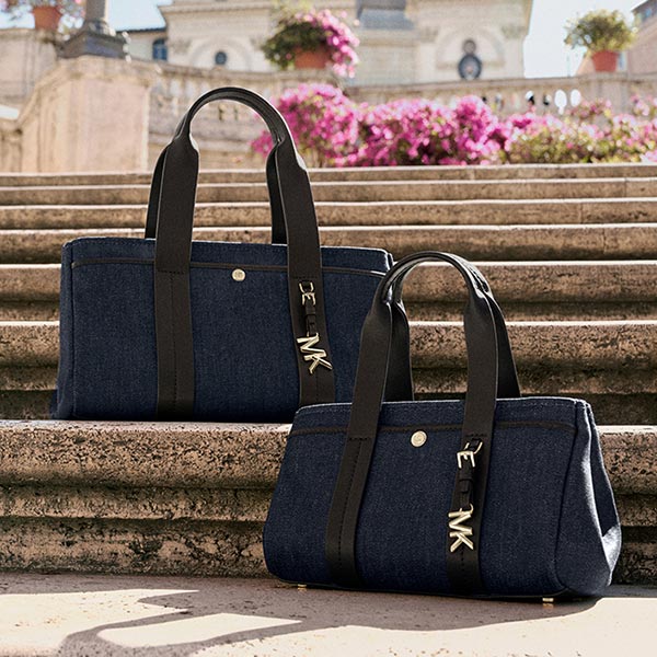 ハンドルやトリムに用いられたレザーがリッチなアクセントとなり、付属の“MK”ブランドロゴチャームが輝きを添えます。