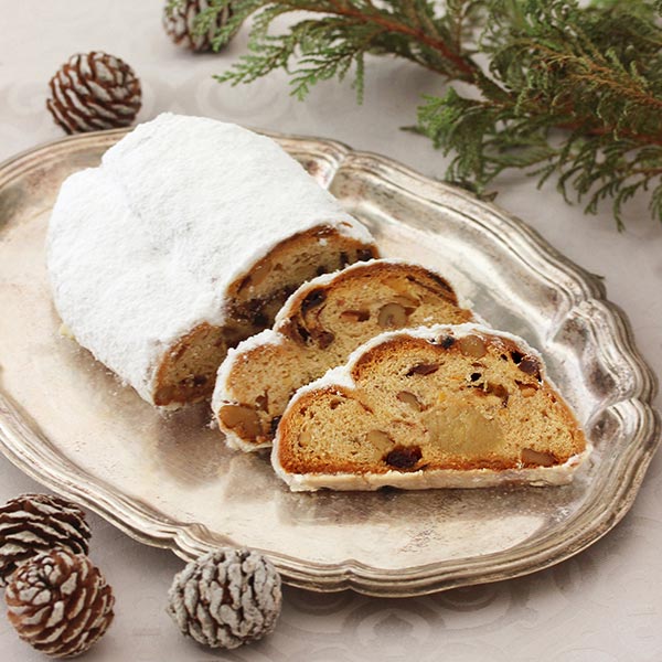 ラム酒とブランデーにじっくり漬け込んだドライフルーツとシナモン、バニラ、そして贅沢に使用したバターのコクが、日を経るほどにまろやかな深い味わいを生み出します。中に入ったマジパンの食感と、ナッツの香ばしさが、程よいアクセントに。