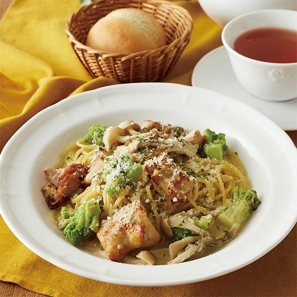 ポルチーニや、たまり醬油などを使用したコクのあるクリームソースに、ローストチキンと舞茸、しめじ、ロマネスコを合わせました。