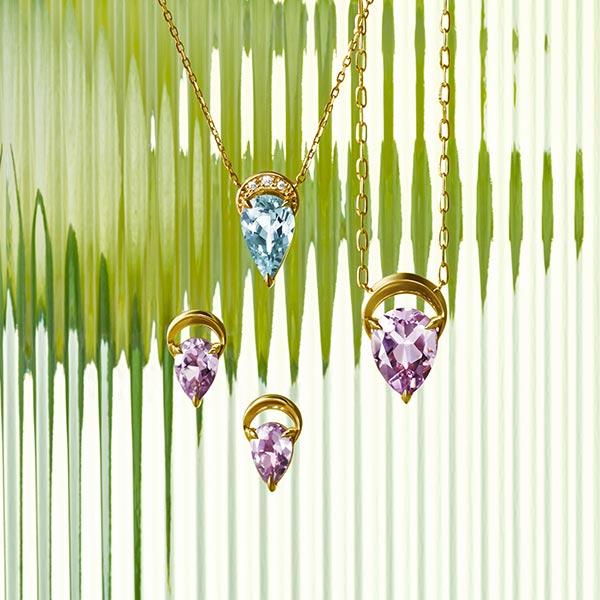 三日月をイメージした地金の造形とカラーストーンの洗練された美しさを組み合わせ、ティアドロップの上品さを〈スタージュエリー〉らしく表現したシリーズ。