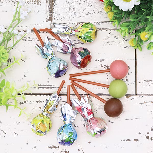 自家製ナッツペーストを抹茶・ミルク・ストロベリーチョコでコーティングした、ロリポップ型チョコレート。ナッツは食感と香ばしい風味を楽しめるよう粗挽きに。