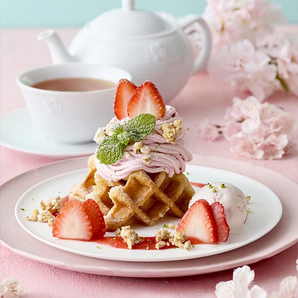 ワッフルにレモンチーズホイップを重ね、さくらホイップと苺のトッピング。ほんのりさくらが香るストロベリーソース、さくらアイス、ホワイトチョコとメレンゲのグラノーラとともに。