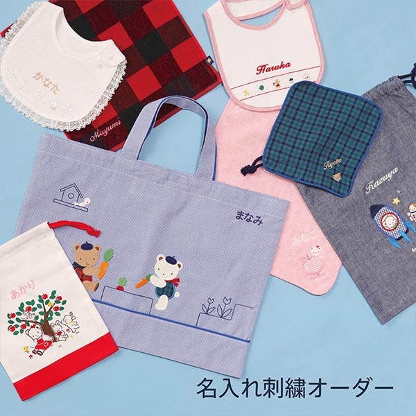 レッスンバッグや巾着、スタイなどギフトにもぴったりな商品にお名前を刺しゅうし、特別なオリジナルアイテムに仕上げます。刺しゅうカラーは8色、フォントは3種類よりお選びいただけます。