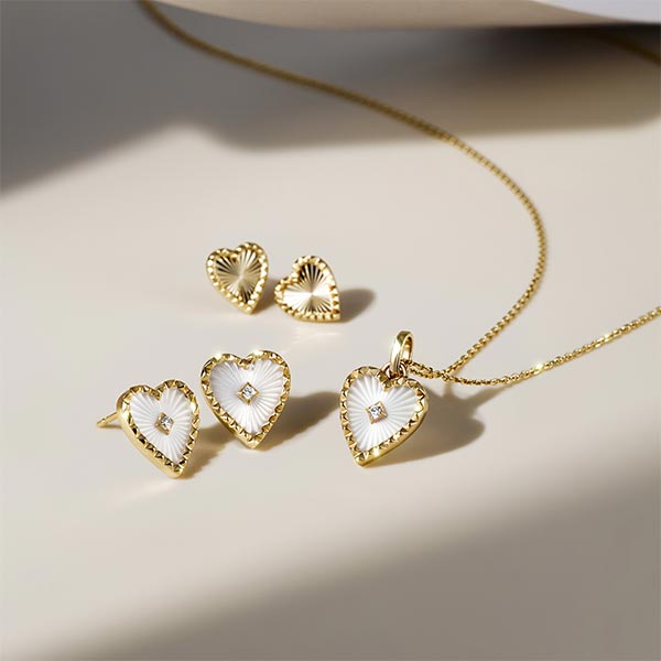 人気シリーズの「ETCHED HEART」。マザーオブパールにギョーシェ彫りを施した新デザインが登場!放射状の彫りのセンターにダイヤモンドを一石あしらい、ゴールドスタッズの縁取りとのコントラストが魅力です。丁寧にカッティングされたラインが反射し、マザーオブパールならではの艶をより堪能できます。