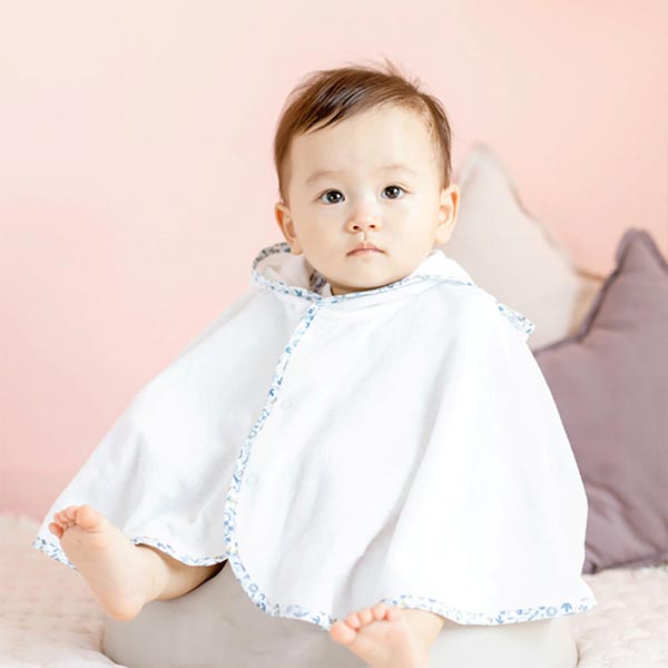 UVカット加工を施した夏に重宝するケープ。 デリケートな赤ちゃんの肌を紫外線から守ります。 やわらかな肌触りが気持ちいい綿パイル生地のケープは、さっと羽織れてお外遊びやお出かけにぴったりのアイテムです。