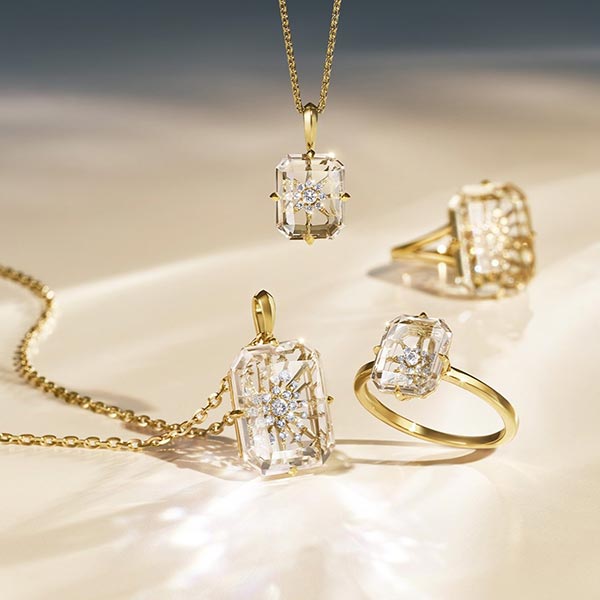 クォーツの透明感と光の反射で自分自身の内面に宿る美しさを表現したジュエリー。