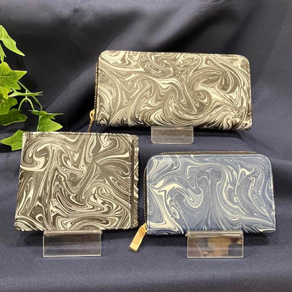 日本に古くから伝わる「墨流し(すみながし)」と呼ばれる染料を水面に垂らし自然に広がる模様を革に写しとる技術を採用したレザーグッズ。