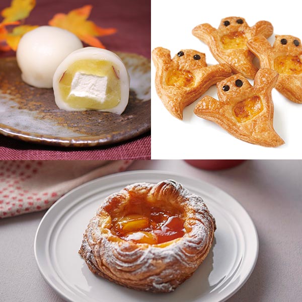 【ミニワン】北海道産かぼちゃを使用した自家製カスタードクリームを絞り、オバケデザインに焼き上げたパン。