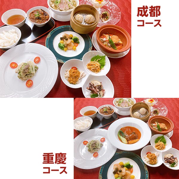 「あかね和牛の薄切り葱山椒和え」を含む7品の『成都コース』と、「フカヒレと鶏手羽のピリ辛豆板醤煮込み」を含む8品の『重慶コース』をご用意。皆様でぜひ、素敵なディナータイムを楽しみください。