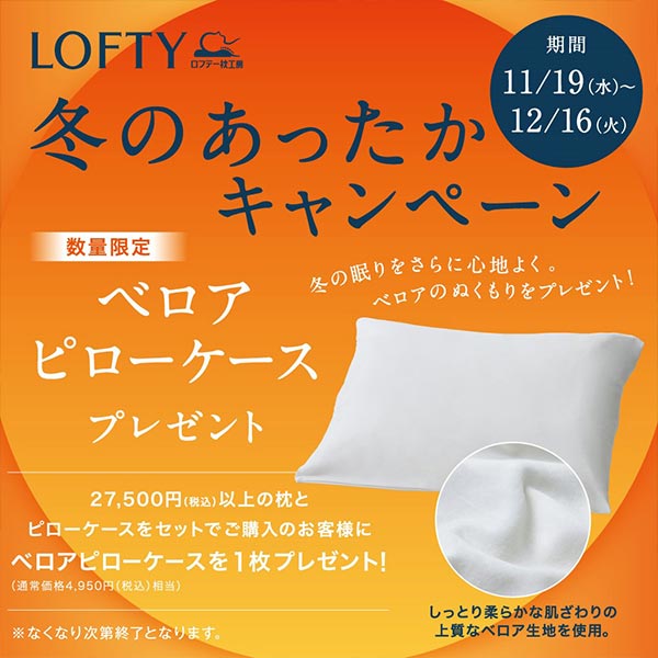税込 27,500円以上のピローとピローケースをセットでご購入の方に4,950円相当のベロアピローケースを1枚 プレゼント!