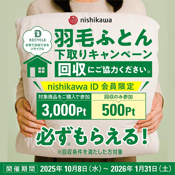 対象の羽毛ふとんを税込30,000円以上ご購入のうえ、お手持ちの羽毛ふとんを下取りに出していただいた方に「nishikawaポイント」3,000ptをプレゼント!