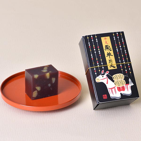 丹念に練り上げた小豆羹に刻み栗を散らし入れた栗羊羹です。干支「午」に因んだパッケージに仕上げました。